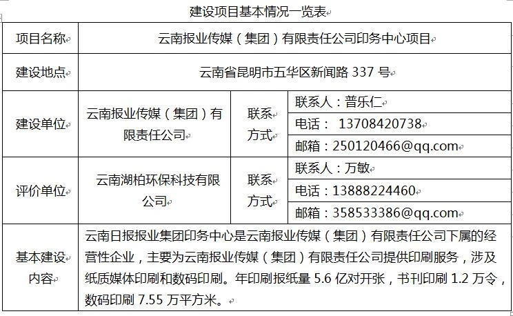 根據國家環保部辦公廳關于印發《建設項目環境影響評價政府信息公開指南(試行)》的通知(環辦〔2013〕103號)的相關要求,現對《云南報業傳媒(集團)有限責任公司印務中心項目環境影響報告表》進行全本公開。公開時間: 2021年01月15日-2021年01月28日。我單位承諾,公示項目信息均真實有效。如有意見,請按以下聯系方式反饋,我單位將積極配合處理。