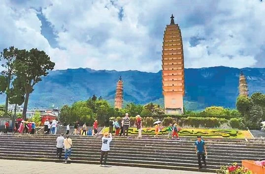 5月24日一早,游客陸續來到大理崇圣寺三塔景區,拍照留影,放心游玩。漾濞發生6.4級地震后,景區立即啟動應急預案,對三塔進行檢查,地震時三塔有明顯晃動,但沒有對主體安全結構造成損壞。同時景區采取了相應的安全應急措施,一直正常對外開放。(記者 莊俊華 通訊員 馬良敏 攝)