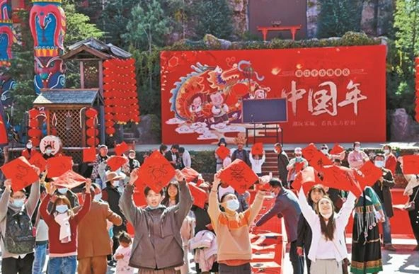農歷大年初一,記者來到麗江千古情景區,入口處景區工作人員正在對入園游客進行體溫測量、掃碼登記。廣場上,25張桌子排成牛字,東巴老師在廣場的舞臺上揮毫潑墨、筆走龍蛇,教授游客書寫東巴文字“牛、福、春、財”,用古老的東巴文字喜迎新年,為游客送去新春祝福。