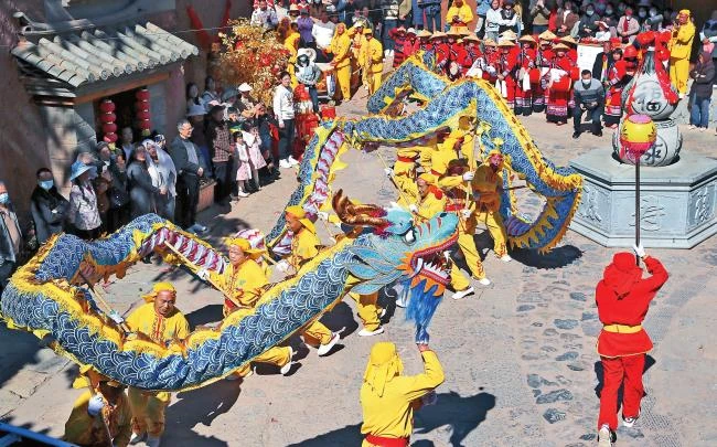 1月22日,昆明市晉寧區福安古村舉行“踩福街”民俗表演,敲響鑼鼓,舞動彩龍,扭起秧佬鼓舞,揮動霸王鞭,村民們歡天喜地慶兔年。(記者 楊崢 通訊員 楊崇云)
