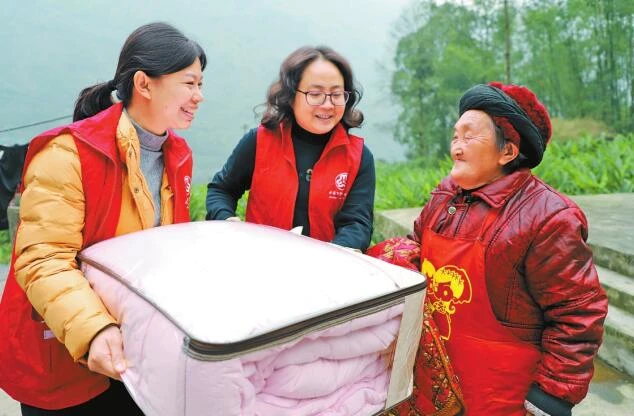 圖④:水富市婦聯(lián)干部開展暖冬行動(dòng),將棉被等防寒物資送到留守老人手中。(記者 陳飛 楊崢 見習(xí)記者 高吳雙 通訊員 狄廷秀 攝)