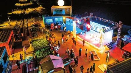 華燈初上,鐵路變成彩虹步道。一路前行,集裝箱里、露營帳篷下,咖啡香氣四溢、烤肉嗞嗞作響、炊鍋熱氣騰騰……人們三五相約、圍爐而坐、相談甚歡。