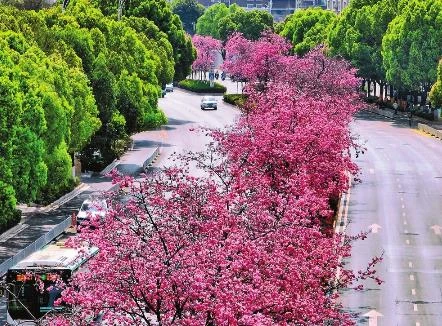 近年來,昆明市充分利用生態景觀資源,積極推進花卉景觀大道建設,全面提升城市綠化品質。圓通街、穿金路上的櫻花,金蘭路上的泡桐,教場中路上的藍花楹,日新路、廣福路和北京路上的月季,文林街上的銀杏,紅塔西路的冬櫻花,龍泉路的梅花等景觀,一路一景,四季有花。目前,昆明市主城區已有100多條道路形成了一定規模的花卉景觀效果,向市民游客展示著四季不同的“花卉文化”和春城魅力。圖為穿金路櫻花大道一景。(記者 胡妤雅 攝影報道)