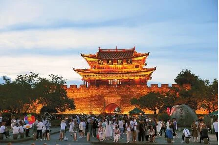 大理白族自治州持續提升旅游品質,不斷豐富文旅新產品、新業態,“旅游+”“+旅游”等旅游產品遍地開花,旅游業煥發勃勃生機,整個暑期保持游客高流量狀態。圖為流光溢彩的大理古城南門吸引大量游客。(記者 陳飛 攝)