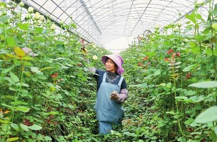 圖為農戶在晉寧區綠色高效花卉生產示范基地大棚里給玫瑰花修枝。(記者 周燦)