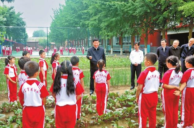 隨后,習近平來到學生農場。這里是學生開展農業種植活動的實踐場所,陽光下、田壟上,一排排綠油油的菜苗生機勃勃。孩子們拿著水桶、鏟子、耙子、毛筆,為西紅柿、黃瓜等澆水、松土、除草、授粉。習近平強調,很多知識和道理都來自勞動、來自生活。引導孩子們從小樹立勞動觀念,培養勞動習慣,提高勞動能力,有利于他們更好地學習知識。現在一些城里的孩子接觸農村、接觸大自然少,不光“四體不勤”,而且“五谷不分”,對吃的是什么、從哪里來的、怎么來的都不知道,更體會不到“誰知盤中餐,粒粒皆辛苦”。他對同學們說,認識大自然,首先要從認識身邊的植物開始。同學們栽培的各種植物,雖然書本上都有介紹,但大家親手種、親自培育、跟蹤觀察,收獲肯定是不一樣的。希望同學們從“學農”中感受到農作的艱辛和農民的不易,從小養成熱愛勞動、珍愛糧食、尊重自然的良好習慣,為建設美麗中國作貢獻。新時代生態文明建設要從娃娃抓起,通過生動活潑的勞動體驗課程,讓孩子親自動手、親身體驗、自我感悟,讓“綠水青山就是金山銀山”的理念早早植入孩子的心靈。