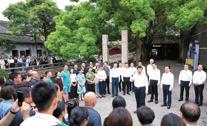 7月5日至7日,中共中央總書記、國家主席、中央軍委主席習近平在江蘇考察。這是6日上午,習近平在蘇州平江歷史文化街區,同當地居民和游客親切交流。新華社記者 燕雁 攝