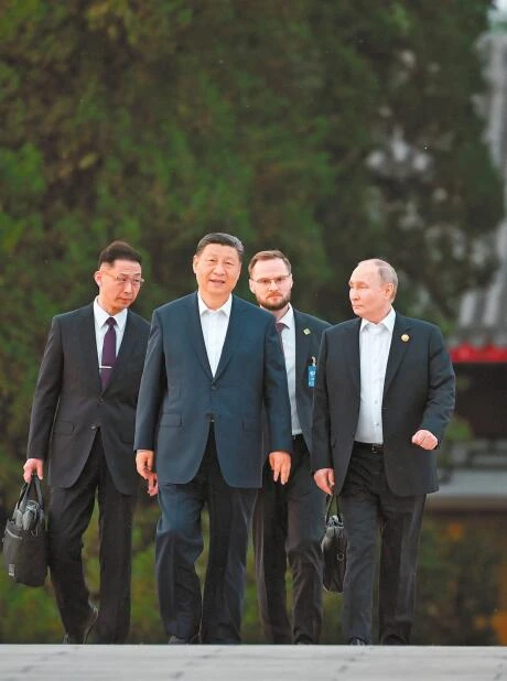 習近平在瀛臺橋前迎接普京。兩國元首邊走邊談,看亭臺樓榭,賞萬物并秀。