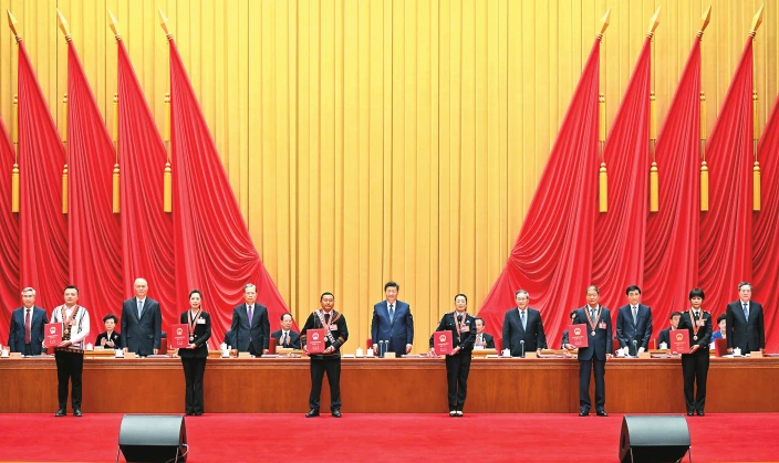 在歡快的樂曲聲中,習近平等為受表彰的模范個人和模范集體代表頒獎。