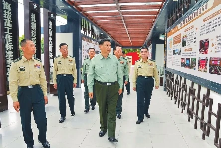 金秋十月,江淮大地山水秀麗、風(fēng)景如畫。上午11時許,習(xí)近平來到火箭軍某旅,首先察看了該旅軍史長廊。該旅是一支有著50多年光榮歷史的戰(zhàn)略導(dǎo)彈部隊。黨的十八大以來,該旅在習(xí)近平強軍思想指引下,堅定舉旗鑄魂,大抓實戰(zhàn)化訓(xùn)練,出色完成一系列重大任務(wù)。在反映部隊發(fā)展歷程、新時代全面建設(shè)的展板前,習(xí)近平詳細(xì)了解官兵學(xué)習(xí)黨的創(chuàng)新理論、加緊練兵備戰(zhàn)、弘揚優(yōu)良傳統(tǒng)等情況。