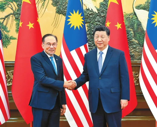 習(xí)近平強調(diào),雙方要發(fā)展高水平戰(zhàn)略伙伴關(guān)系,繼續(xù)保持高層密切交往,加強治國理政經(jīng)驗交流,增進政治互信,堅定支持彼此核心利益和重大關(guān)切。中方支持馬方堅持戰(zhàn)略自主,選擇符合自身國情的發(fā)展道路。雙方要加強發(fā)展戰(zhàn)略對接,深化全方位互利合作,持續(xù)推進高質(zhì)量共建“一帶一路”,共同實施好“兩國雙園”等旗艦項目,打造數(shù)字經(jīng)濟、人工智能、新能源等合作新增長點,探討建立減貧交流合作機制。歡迎馬方用好中國國際進口博覽會平臺,把更多馬來西亞優(yōu)質(zhì)特色產(chǎn)品推向中國。中方愿同馬方深化高等教育、文化、旅游、青年、地方等交流合作,拉緊中馬友好民心紐帶。倡導(dǎo)文明多元共生、和諧包容,踐行以和平、合作、包容、融合為核心的亞洲價值觀,推動中華文明和伊斯蘭文明在互學(xué)互鑒中共同發(fā)展。