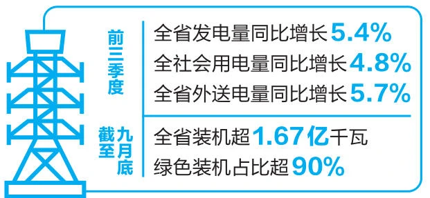 發電量、用電量、送電量持續增長,有力支撐全省經濟發展。今年前三季度,全省發電量同比增長5.4%,全社會用電量2148.35億千瓦時,同比增長4.8%,其中,一二三產用電量同比分別增長10.2%、3%、10%;全省外送電量同比增長5.7%,作為“西電東送”戰略的重要省份,今年全省“西電東送”電量預計超過2100億千瓦時,再創新高。截至9月底,全省裝機超1.67億千瓦,其中,綠色電力裝機超1.5億千瓦,綠色裝機占比超90%,綠色底色更加鮮明。