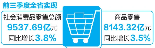 來自省統計局的數據顯示,前三季度,全省實現社會消費品零售總額9537.69億元,同比增長3.8%。按經營所在地分,城鄉消費持續增長,鄉村增速快于城鎮。城鎮實現消費品零售額7889.52億元,同比增長3.7%;鄉村實現消費品零售額1648.17億元,同比增長4.5%,增速較城鎮高0.8個百分點。
