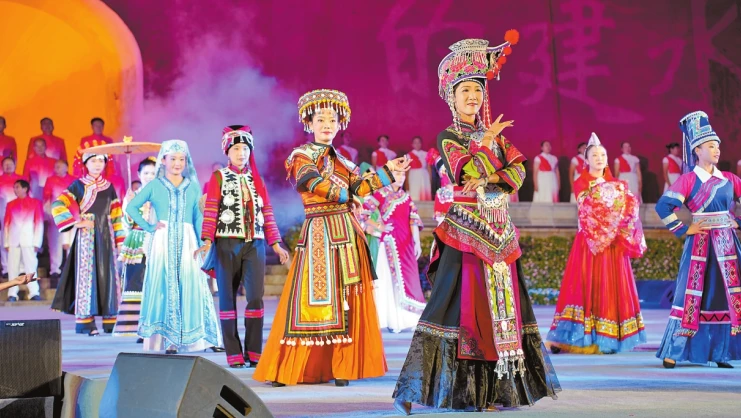 夜幕降臨,古樸厚重的朝陽樓在霓虹映襯下盡顯風華。隨著激昂深情的《我的祖國》旋律響起,活動拉開序幕。6個走秀片段依次呈現,華服化作文明的載體,訴說不忘文化根源的初心,衣袂流轉間展現山川市井文明生機。在“家園共筑·建水一家親”主題演出中,《千年紫陶》《遇見建水》等歌曲輪番上演,以旋律展現建水的美食、美景與民俗文化。燈火映照下,游客與市民歌舞同歡,共唱幸福。