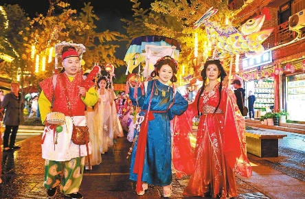 昆明融創(chuàng)文旅城“云津夜市”情景演出吸引游客。 記者 王毅 攝