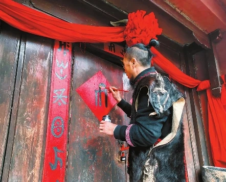 圖②:1月28日,在云南民族村,彝族小伙李虎用彝族文字書寫春聯。 記者 王毅 攝