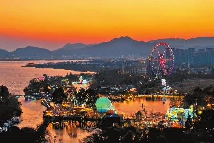 2月12日,昆明市大觀公園的璀璨燈火與西山的漫天霞光交相輝映,呈現出別樣之美。 (記者 黃興能 攝)