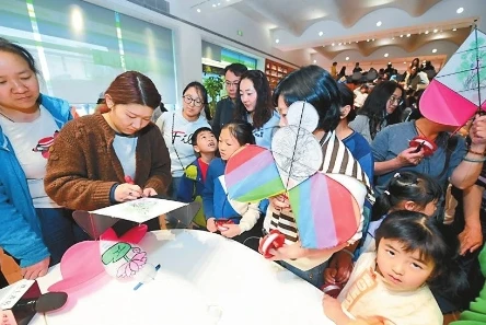 4月12日,在昆明市盤龍區拓東街道璞玉書店內,“春風和氣飛紙鳶” 非遺滇式風箏體驗活動熱鬧啟幕,50多組親子家庭圍坐桌邊,在非遺傳承人的指導下繪制風箏。