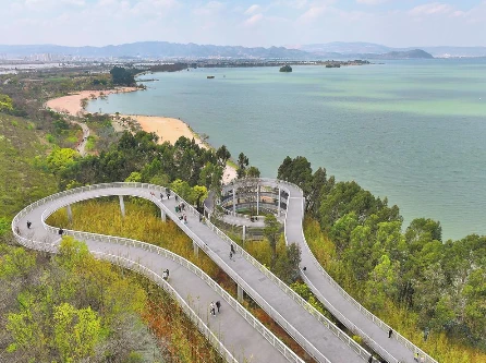 近年來,昆明市堅持生態優先、綠色發展,讓“昆明藍”“滇池清”“春城綠”“四季花”的名片更加亮麗。2018年以來,滇池水質連續7年保持Ⅳ類,新增濕地為鳥類提供了良好的棲息環境。圖為滇池南岸美景。(記者 黃興能 攝)