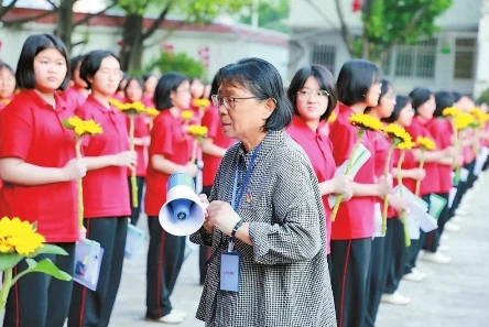 7時(shí)整,送考時(shí)刻來(lái)臨。操場(chǎng)上,張桂梅和老師們將一朵朵寓意著“一舉奪魁”的向日葵鄭重遞給學(xué)生,輕聲鼓勵(lì):“向著太陽(yáng),勇敢綻放!”