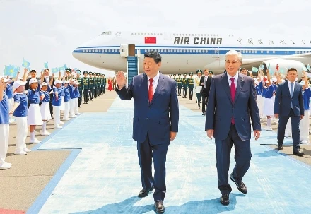 習近平抵達阿斯塔納納扎爾巴耶夫國際機場時,托卡耶夫總統率總統辦公廳主任達杰拜、副總理兼外長努爾特列烏、總統外事顧問卡濟漢、阿斯塔納市長卡瑟姆別克等高級官員熱情迎接。身著盛裝的哈薩克斯坦女青年向習近平獻花。禮兵分列藍地毯兩側致敬,哈薩克斯坦少年兒童手持中哈兩國國旗熱烈歡迎習近平到訪。習近平在托卡耶夫陪同下觀看儀仗隊分列式,直升機懸掛中哈國旗從機場上空飛過。在機場貴賓樓內,兩國元首還共同欣賞哈薩克斯坦少年兒童的文藝表演。